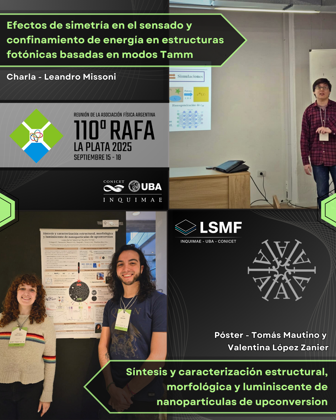 La charla contó con la presencia de varios integrantes del LSMF. Sara Aldabe Bilmes presentó trabajos sobre coloides de nanopartículas metálicas, mientras que Valentina López Zanier y Tomás Mautino expusieron su proyecto de Laboratorio 6 y 7 sobre nanopartículas de upconversion. Por otro lado, María Luz Martínez Ricci, Marcos Illescas y Leandro Missoni mostraron estudios y aplicaciones de cristales fotónicos, mientras que Gonzalo Urquía explicó sobre la optimización en el diseño de estos materiales mediante el uso de machine learning.